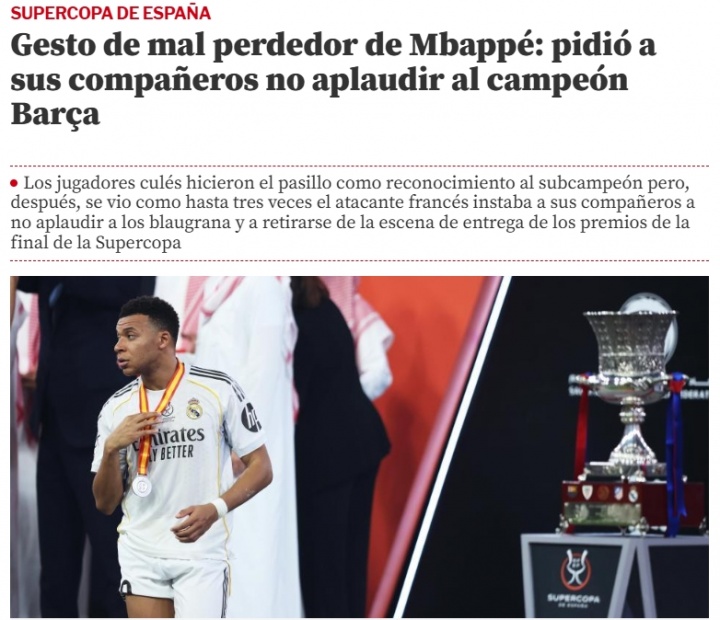 《世体》表示,姆巴佩要求他的队友们不要为巴萨鼓掌,巴萨球员为他们进行了列队,但姆巴佩却三次敦促他的队友们不要为巴萨鼓掌,并尽早离开超级杯决赛颁奖典礼现场。